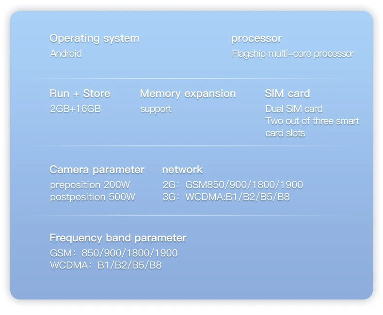 • 3G WCDMA: B1/B2/B5/B8